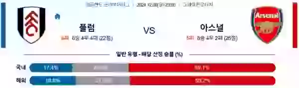 아스날이 체급 차이를 증명하며 경기를 지배할 것으로 보인다. 풀럼은 수비 불안과 전진 패스 부족으로 역습에서도 어려움을 겪을 가능성이 크다. 아스날 승리와 언더(2.5 기준)가 유력하다.