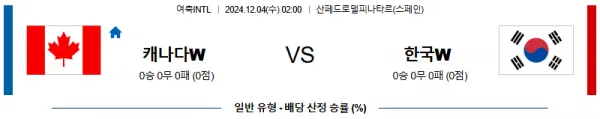 캐나다가 경기 주도권을 장악할 가능성이 높다. 캐나다는 공격과 수비 모두 안정적인 호흡을 바탕으로 대한민국을 압박할 것이다. 반면, 대한민국은 느린 템포와 체력 문제로 후반에 실점할 가능성이 크다. 캐나다W 승 / 오버(2.5 기준)가 예상된다.