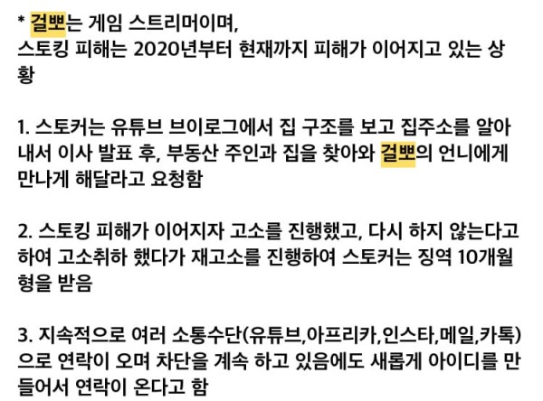 출소한 스토커한테 오늘까지 괴롭힘당하고 있는 스트리머...jpg