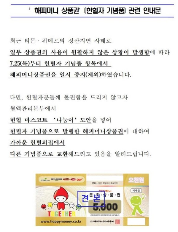 헌혈지급용으로 해피머니 64억어치 구매한 적십자