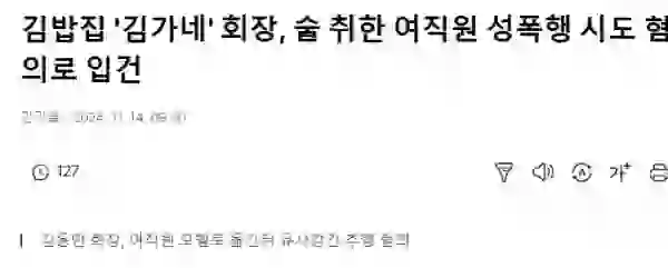 김밥집 '김가네' 회장, 술 취한 여직원 성폭행 시도 혐의로 입건 ㄷㄷㄷㄷㄷㄷㄷ