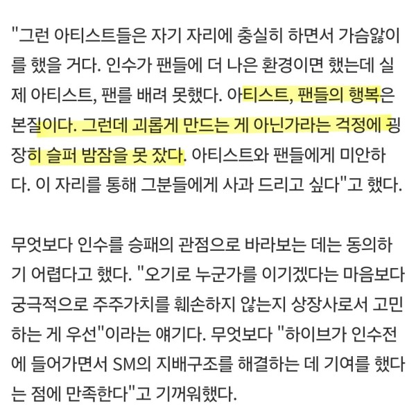 " SM 아티스트들과 팬들에게 미안하다. 걱정되고 굉장히 슬퍼서 잠을 못잤다"